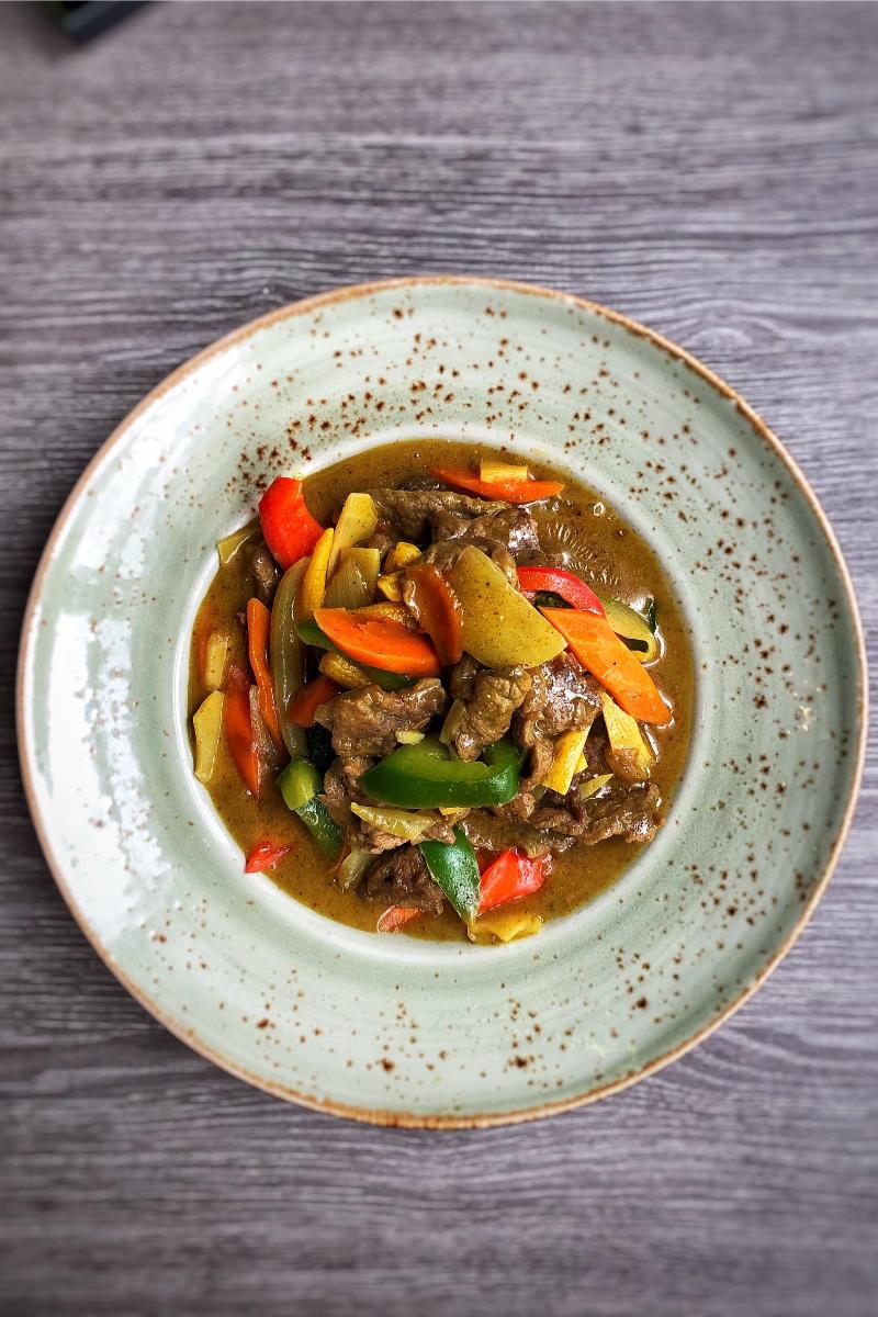 Serveres med løk, gulrot, bambusskudd, paprika og ris