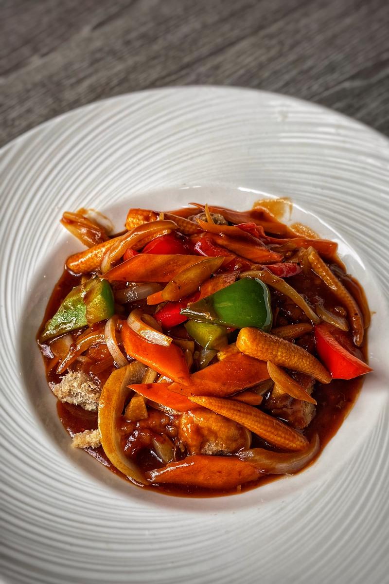 Serveres med bambusskudd, baby mais, løk, hvitløk, paprika og ris.